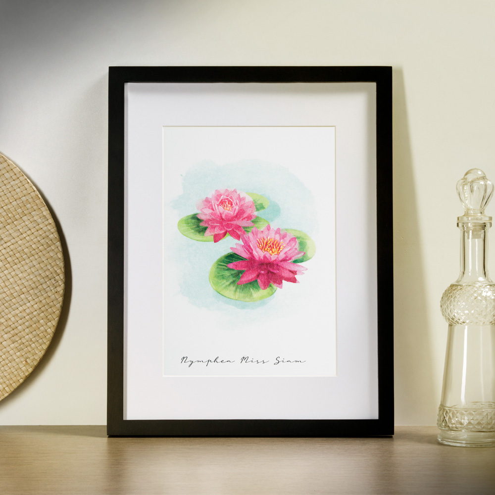 Poster with botanical prints inspired by the gardens of the Borromean Islands. The six versions depict, with illustrations by Ilaria Zanellato, floral species such as protea, camellia, water lily, as well as orange, lemon and kumquat (or Chinese mandarin) plants. Available both individually and in combination with the frame.