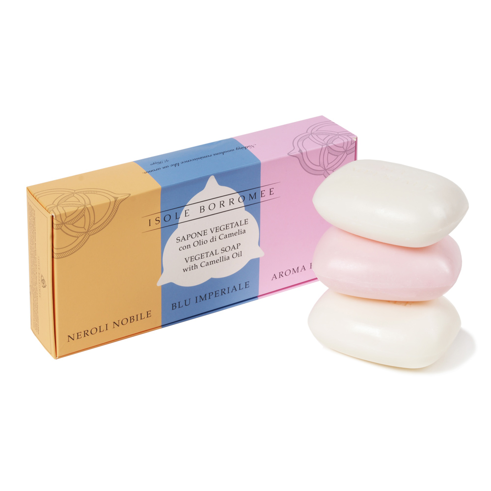 Vegetable soap with camellia oil in the three Terre Borromeo fragrances: Aroma Reale, Blu Imperiale, Neroli Nobile. A souvenir with nourishing and moi