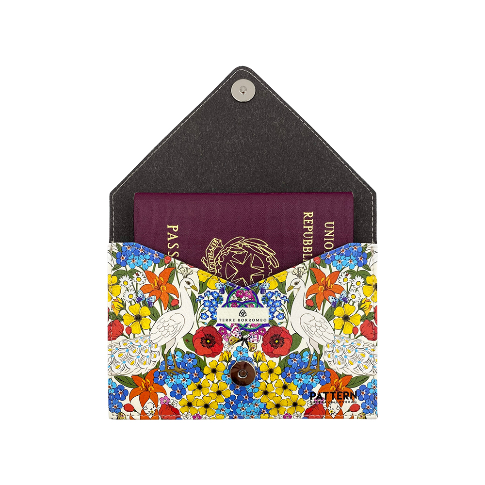 The Mini Travel Made in Italy by Pattern Thetravellovebag x Terre Borromeo. A mini pouch printed on synthetic leather that recalls the classic letter envelope where stamps were glued.